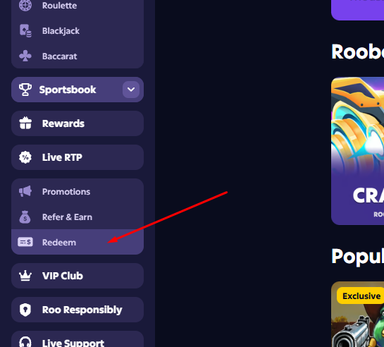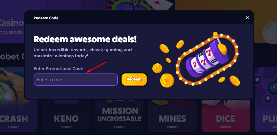 After that, enter your promo code Roobet ‘’HELLAROO’’ and click on Redeem.