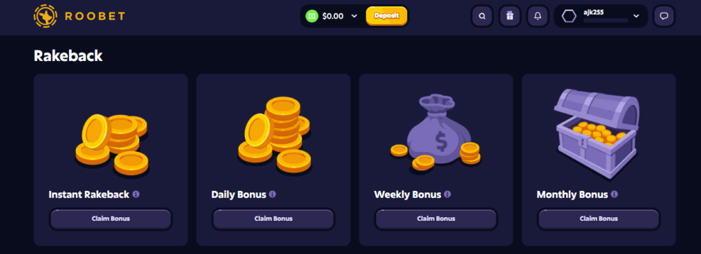 Weekly cashback on Roobet is handled through rakeback and recurring bonuses linked to your play.